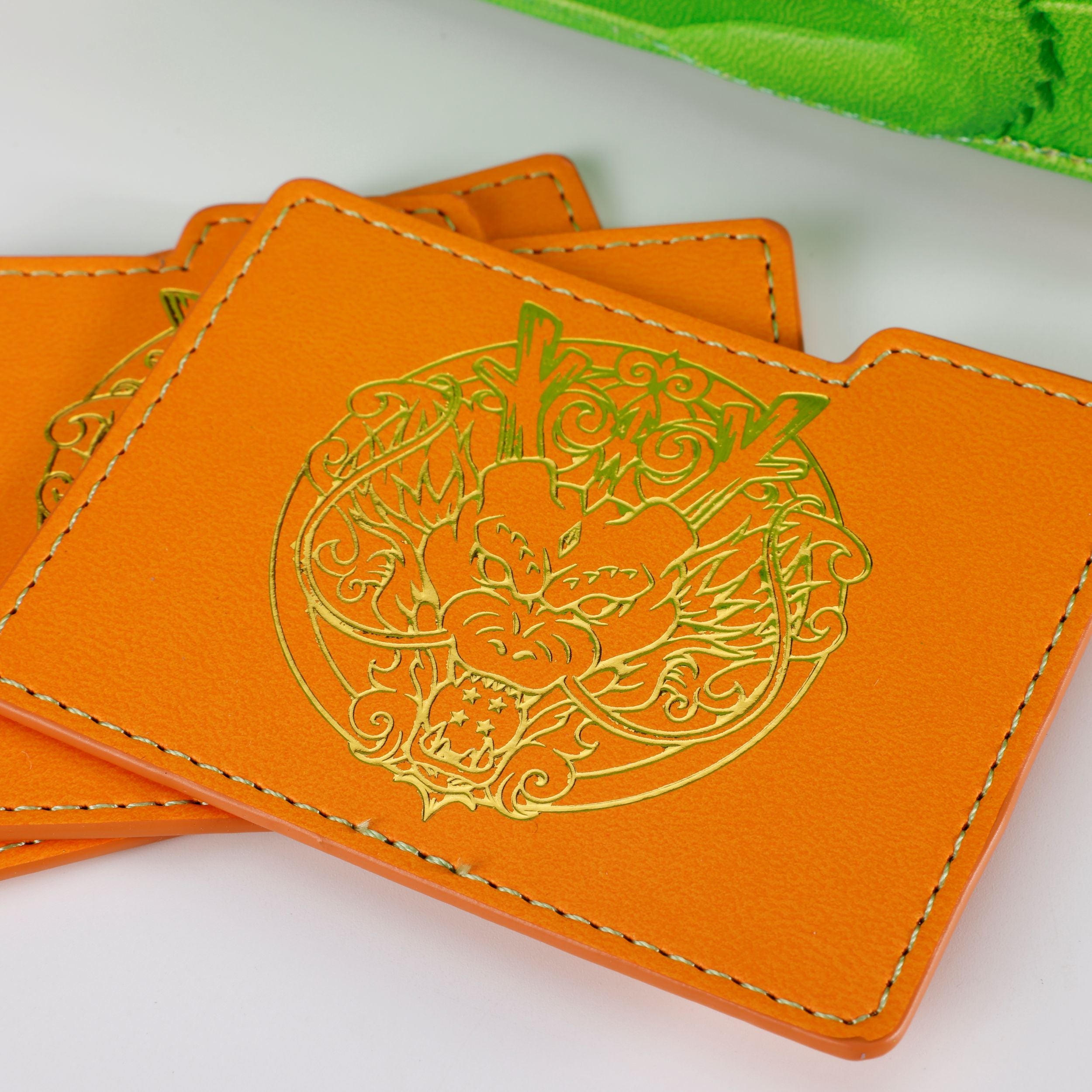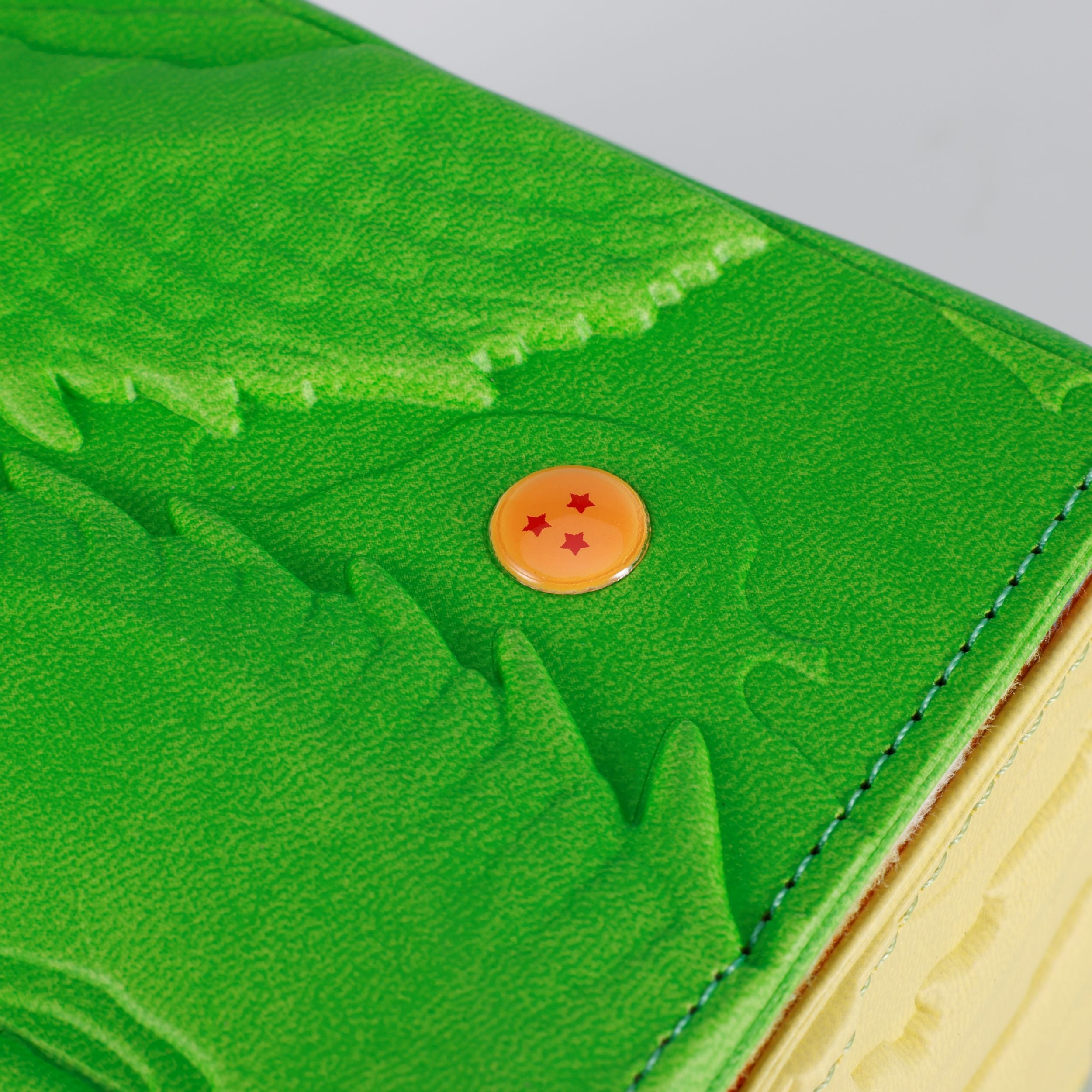 100% PU/Vegan faux leather with raised full exterior artwork with acrylic ornaments, and full color microfiber suede for the flap and deck/dice tray lining.
