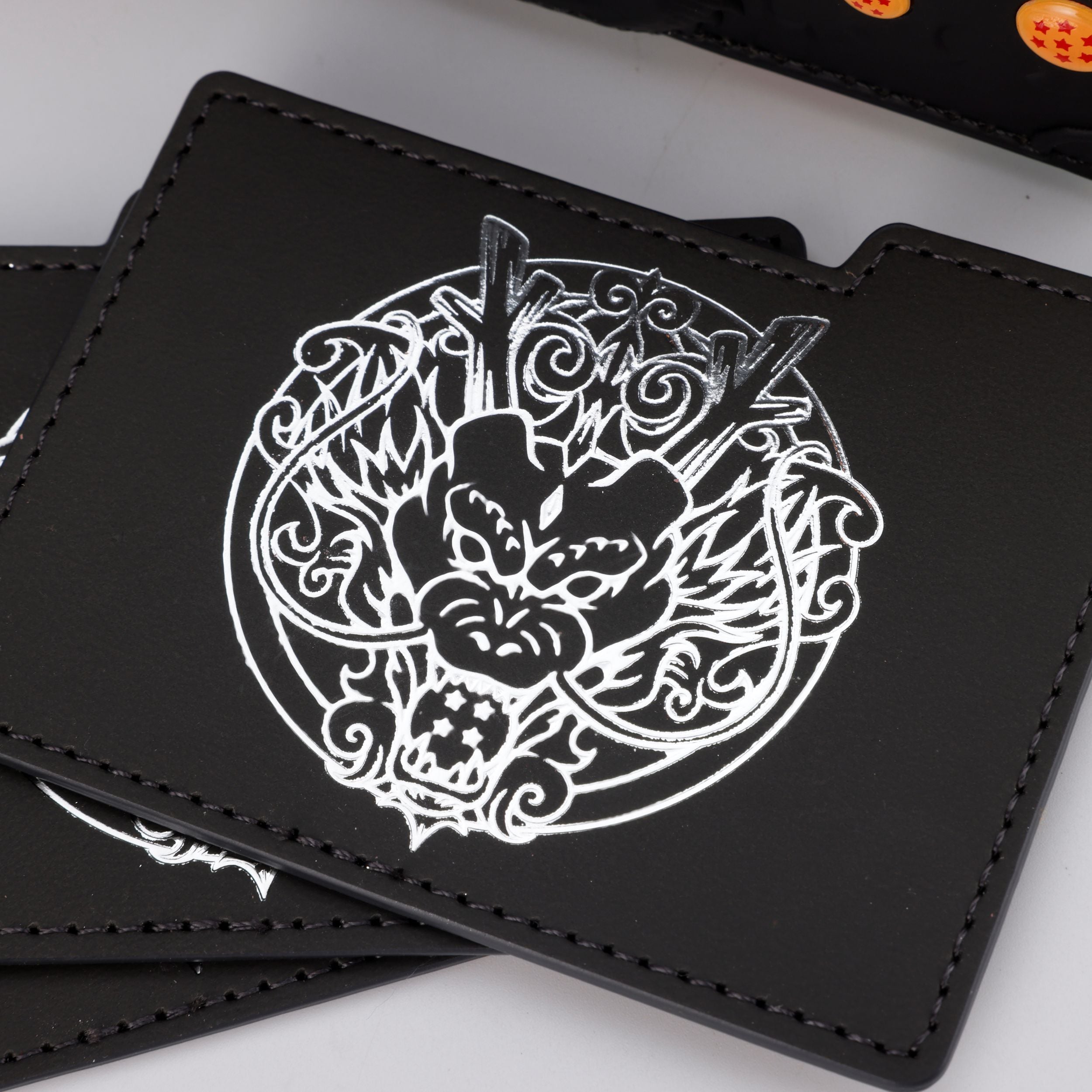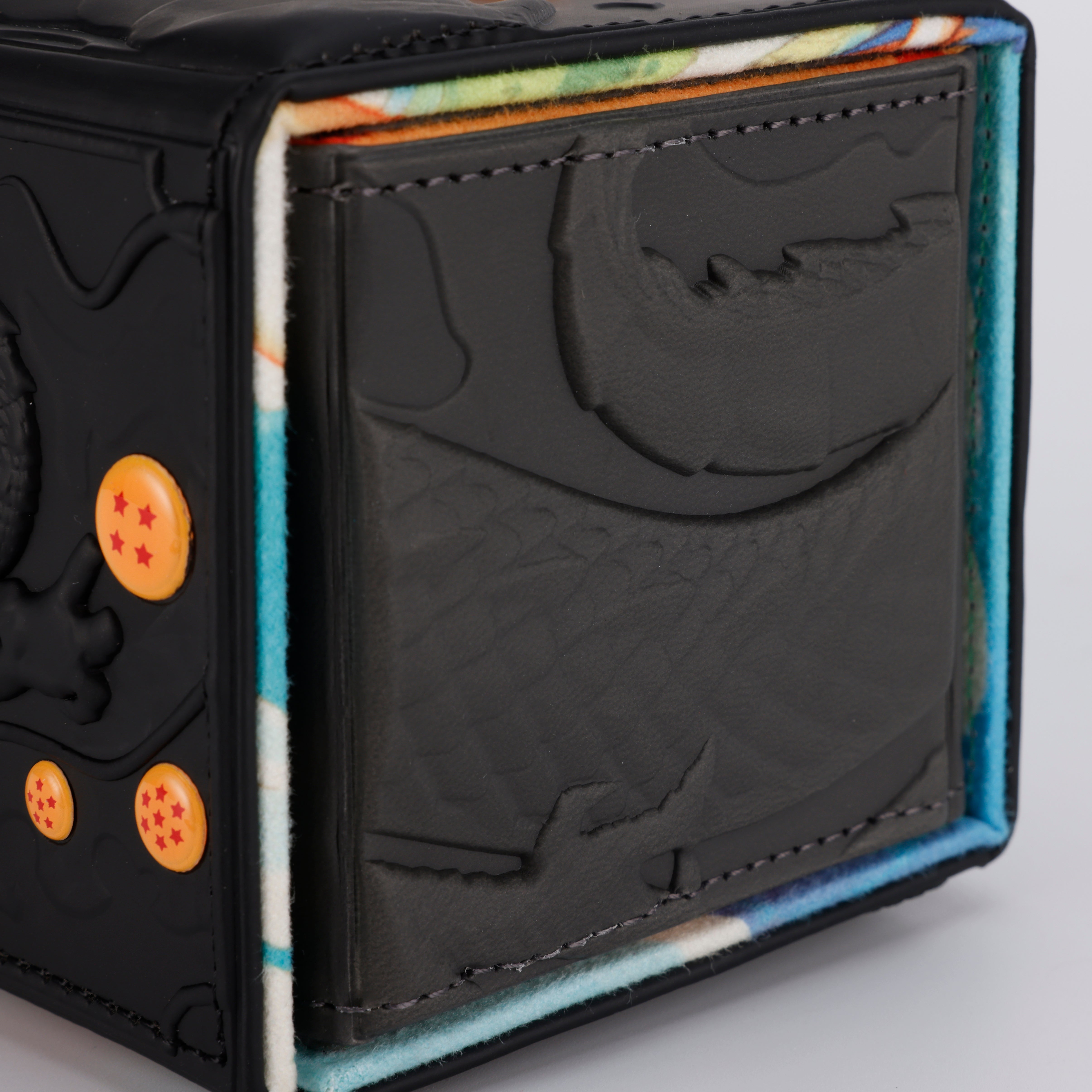 100% PU/Vegan faux leather with raised full exterior artwork with acrylic ornaments, and full color microfiber suede for the flap and deck/dice tray lining.